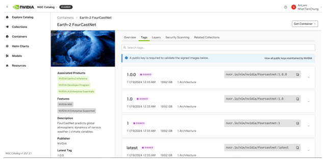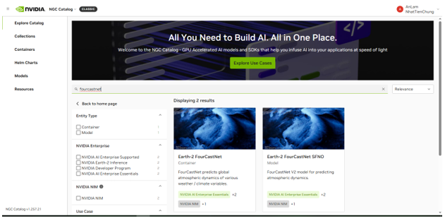 Quay lại trang NGC, ở đây sẽ chứa vô số mô hình đã được NVIDIA huấn luyện sẵn, bạn có thể chọn mô hình dựa theo mục đích của bạn. Ở đây tôi sẽ ví dụ với mô hình FourCastNet đây là một mô hình dự báo thời tiết của NVIDIA.