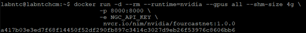 docker run --rm --runtime=nvidia --gpus all --shm-size 4g \ -p 8000:8000 \ -e NGC_API_KEY \ nvcr.io/nim/nvidia/fourcastnet:1.0.0