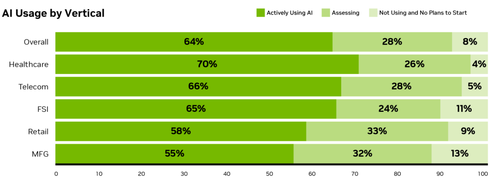 Báo cáo “Thực trạng AI” thường niên của NVIDIA cho thấy AI đang được ứng dụng như thế nào trong các ngành công nghiệp, được sử dụng cho mục đích gì và các công ty đang đạt được lợi tức đầu tư (ROI) ra sao, cũng như những thách thức và mục tiêu của họ với công nghệ này.