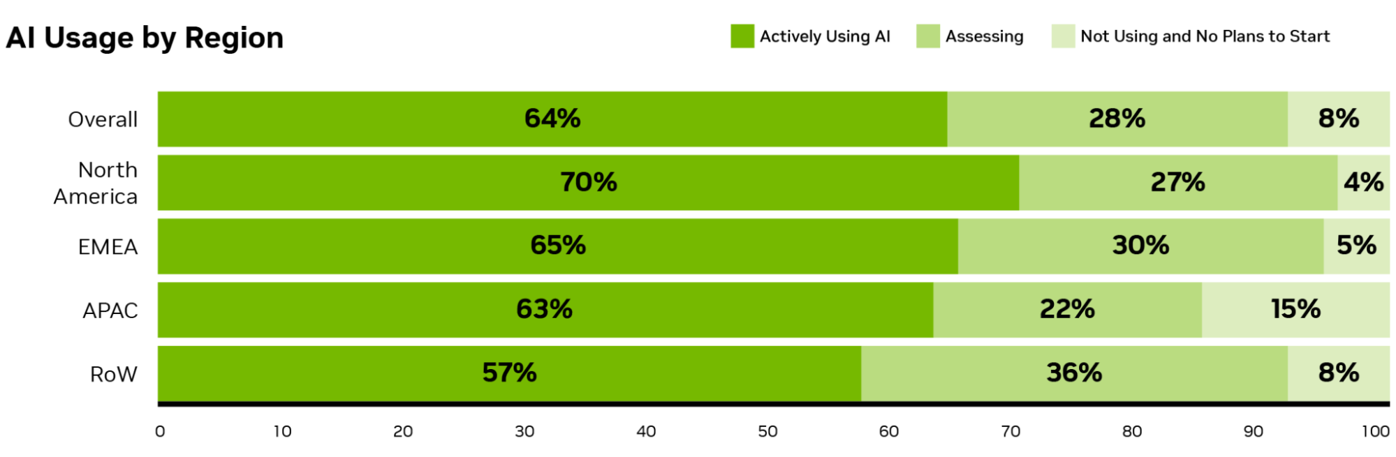 Bắc Mỹ dẫn đầu về việc ứng dụng AI, với 70% người dân đang tích cực sử dụng công nghệ này, 27% đang đánh giá các dự án AI và chỉ 3% cho biết họ không sử dụng AI. Gần hai phần ba (65%) số người được khảo sát ở khu vực EMEA cho biết họ đang tích cực sử dụng AI. Tỷ lệ ứng dụng AI ở khu vực APAC là 63%, với tỷ lệ cao hơn (15%) cho biết họ không sử dụng AI.