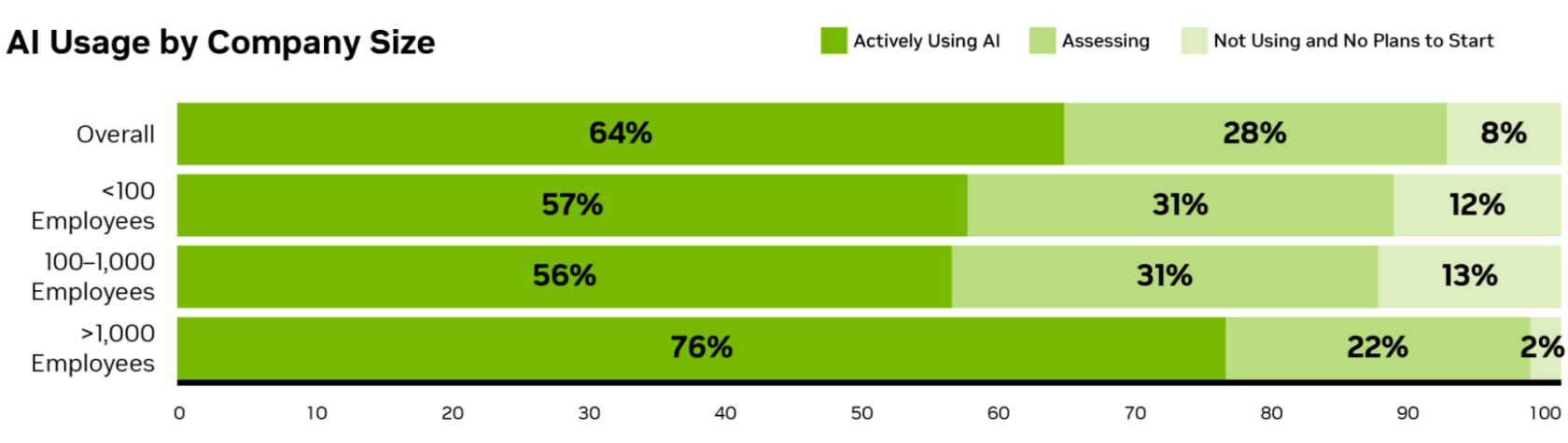 Một điểm chung rõ ràng xuyên suốt tất cả các cuộc khảo sát: Các công ty lớn (với hơn 1.000 nhân viên) thể hiện mức độ áp dụng rộng rãi hơn, triển khai nhiều trường hợp sử dụng hơn và báo cáo lợi tức đầu tư (ROI) cao hơn. Hơn ba phần tư (76%) số người được hỏi từ các công ty lớn cho biết họ đang tích cực sử dụng AI, chỉ có 2% nói rằng họ không sử dụng AI. Những xu hướng này có thể được lý giải bởi thực tế là các công ty lớn có nhiều vốn hơn để đầu tư vào cơ sở hạ tầng AI, các nhà khoa học dữ liệu và chuyên gia, dẫn đến việc các nhà quản lý điều hành các dự án từ giai đoạn thử nghiệm đến sản xuất tập trung vào các trường hợp sử dụng cụ thể và có tác động lớn.