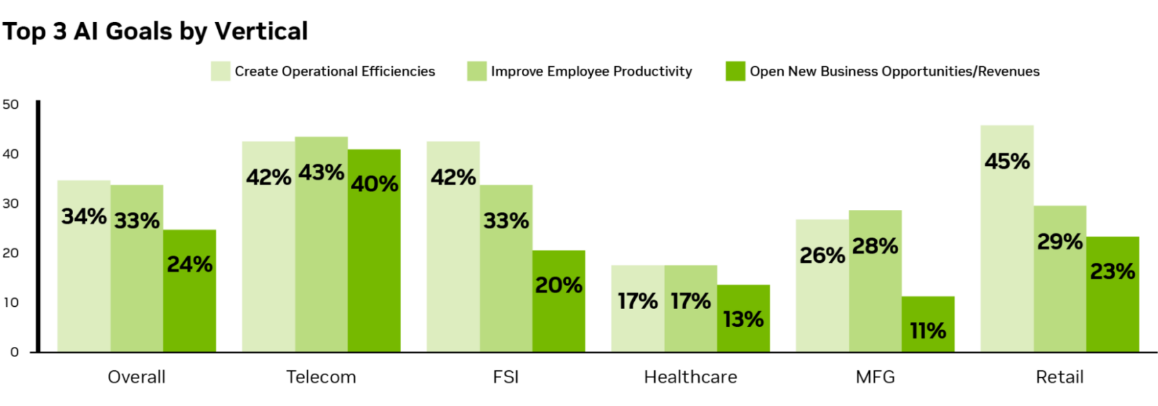 Các cuộc khảo sát năm nay cho thấy ba mục tiêu hàng đầu của AI là tạo ra hiệu quả hoạt động (34%), cải thiện năng suất của nhân viên (33%) và mở ra các cơ hội kinh doanh và nguồn doanh thu mới (23%).