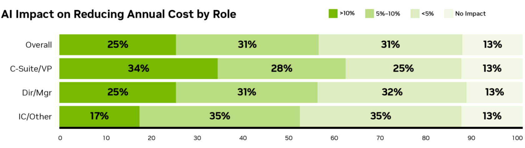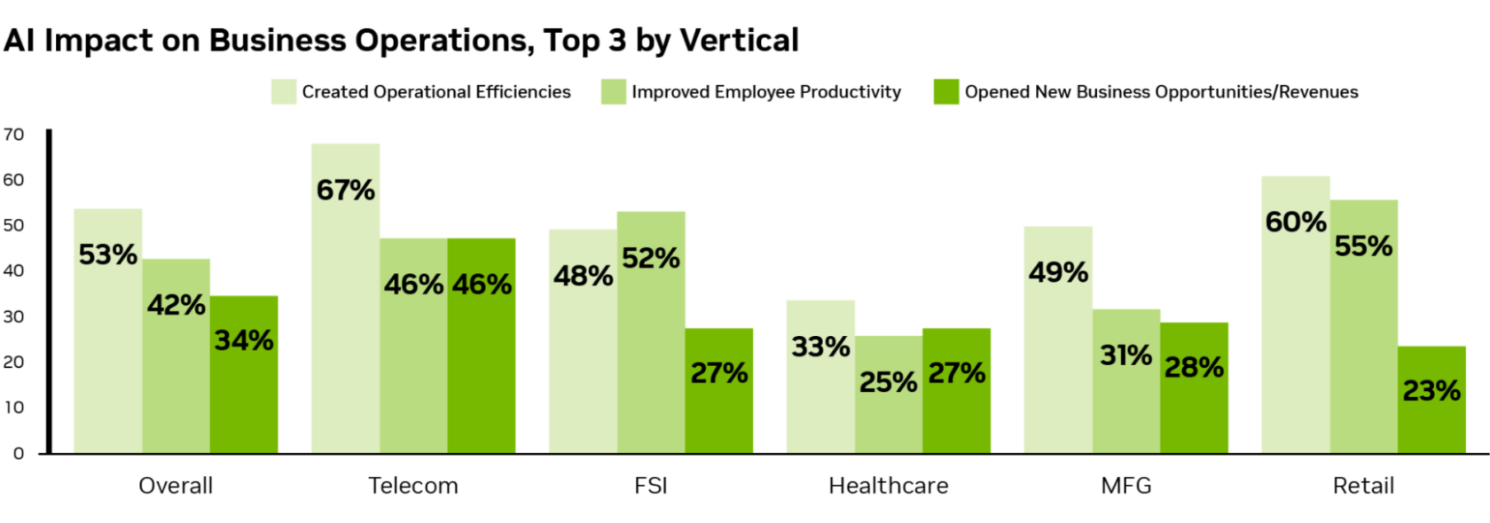 Ví dụ, trong báo cáo Tình trạng AI trong Viễn thông năm nay của NVIDIA , 99% người được hỏi cho biết AI đã giúp cải thiện năng suất của nhân viên, trong đó một phần tư cho rằng công nghệ này mang lại sự cải thiện đáng kể hoặc quan trọng.