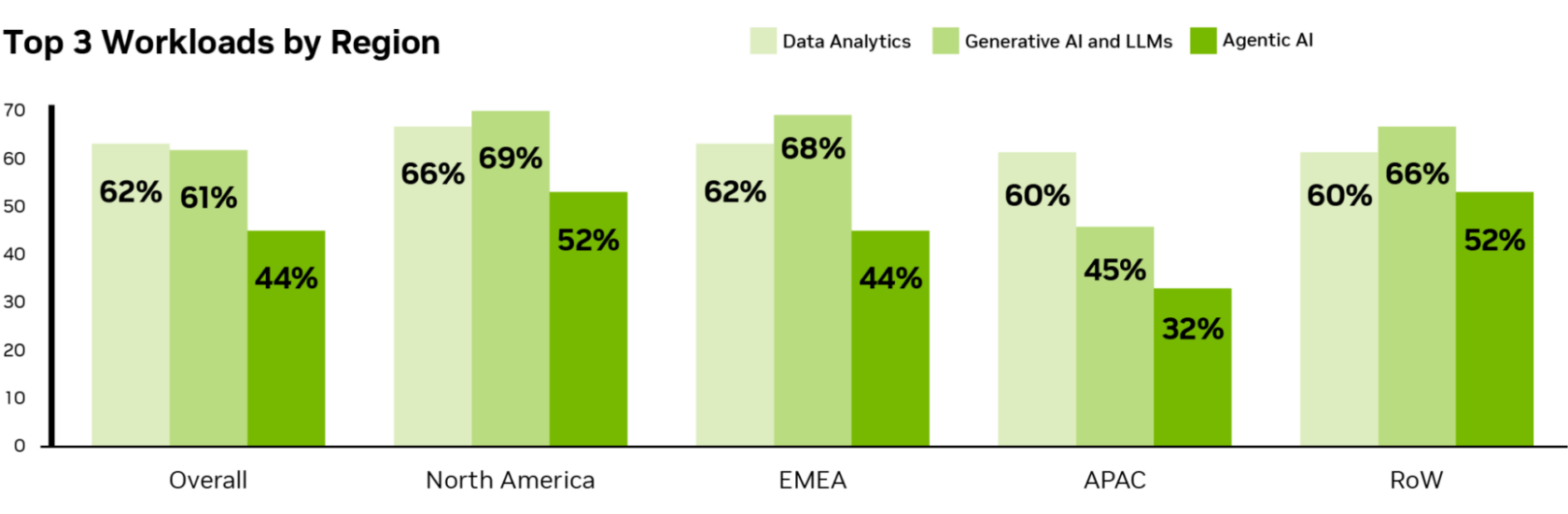 Nhìn chung, 62% người được hỏi cho biết phân tích dữ liệu là một trong những công việc AI hàng đầu của họ. Trí tuệ nhân tạo tạo sinh (Generative AI) đứng thứ hai với 61%, thậm chí còn vượt qua phân tích dữ liệu trong các ngành như chăm sóc sức khỏe, khoa học đời sống và viễn thông. Ngoài ra, trí tuệ nhân tạo tạo sinh là công việc hàng đầu trong số những người được hỏi ở Bắc Mỹ và khu vực EMEA.