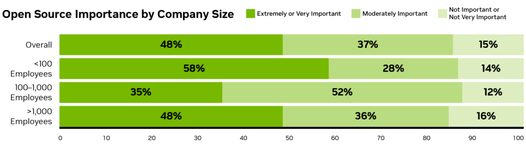 Các công ty nhỏ, thường bị hạn chế về nguồn lực và thích tự xây dựng giải pháp hơn là trả tiền cho các sản phẩm thương mại có sẵn, đặc biệt quan tâm đến mã nguồn mở, với 58% cho rằng mã nguồn mở rất hoặc cực kỳ quan trọng. Hơn một nửa số giám đốc điều hành (51%) trong suốt cuộc khảo sát cũng nhấn mạnh tầm quan trọng cao của mã nguồn mở.